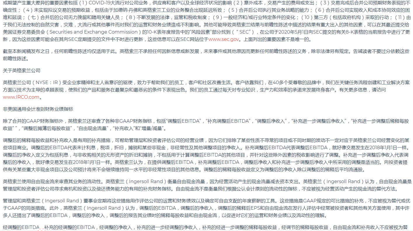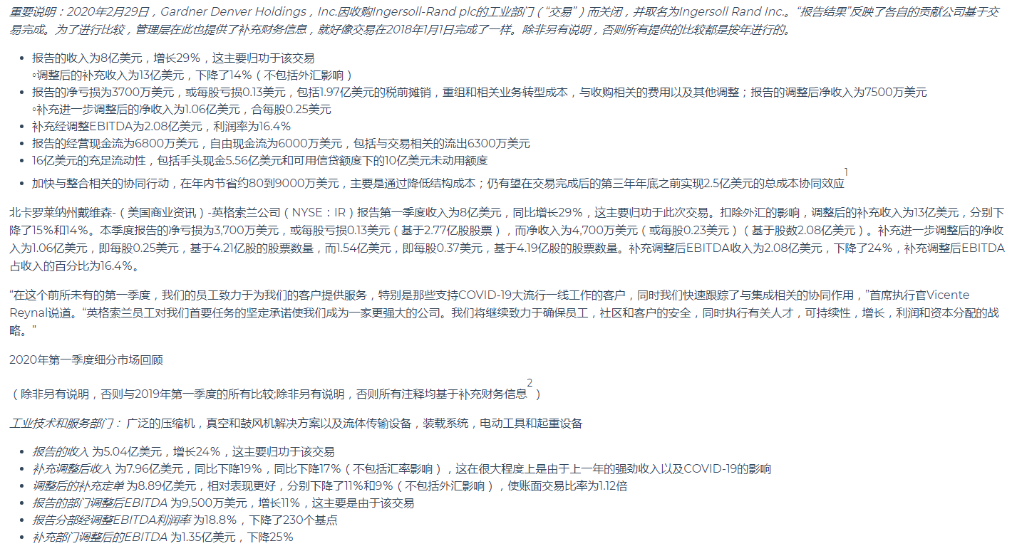 英格索蘭公布2020年第一季度業(yè)績